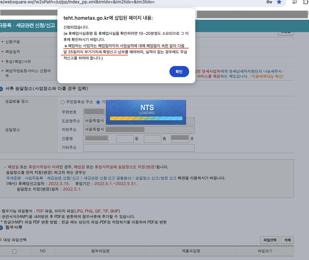 폐업하는 사업자는 폐업일까지의 사업실적에 대한 폐업일에 속한 달의 다음달 25일까지 부가가치세 확정 신고·납부를 해야하면, 실적이 없는 경우에도 무실적 신고를 반드시 해야 한다는 내용의 팝업이 뜨면 확인을 눌러줍니다.