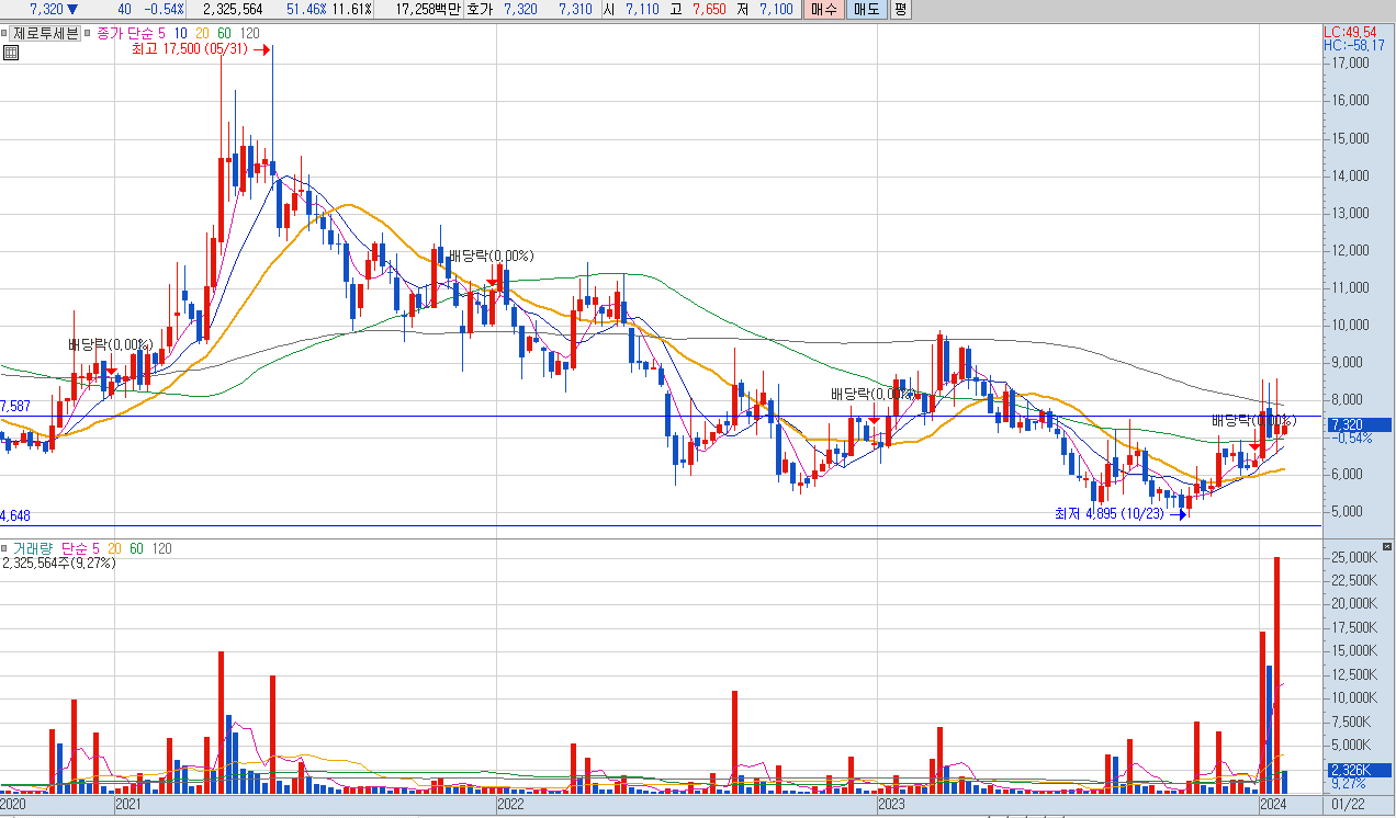 주봉과 월봉 차트로만 보면 아가방컴퍼니가 훨씬 대장주의 모습을 보여주고 있고 제로투세븐은 차트로만 본다면 대장주 다음으로 봐야 하나 싶습니다.