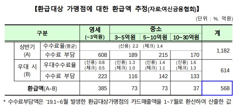 - 신규 신용카드가맹점에 대한 환급규모는 약 568억원