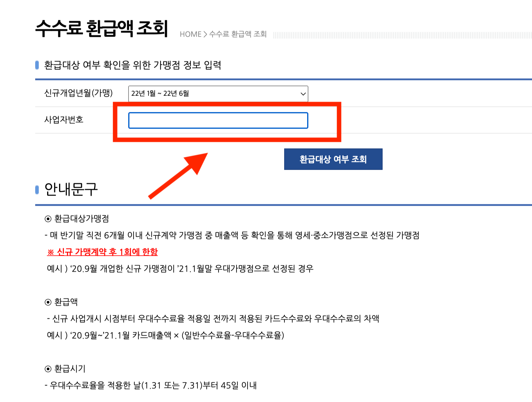 사업자 번호를 입력 한 후에 '환급대상 여부 조회' 를 클릭하면