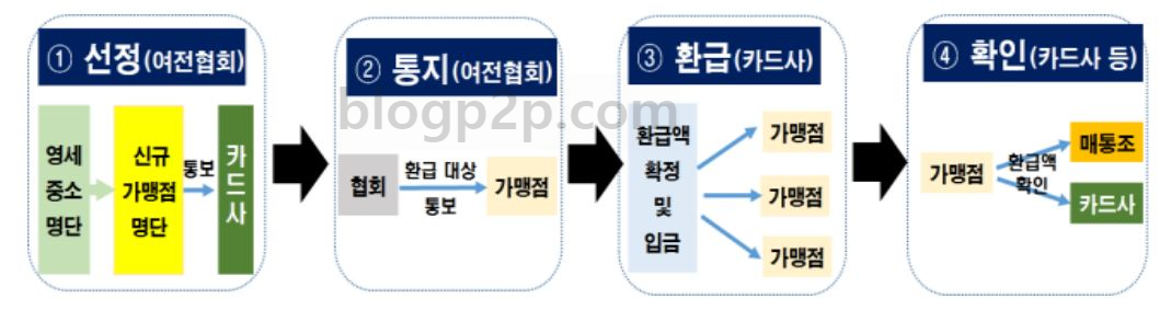 환급 절차는 영세중소 가맹점 명단 → 신규가맹점 명단 → 카드사에 통보 → 협회 환급대상 통보 → 환급액 확정 및 입금 → 가맹점은 환급액 확인