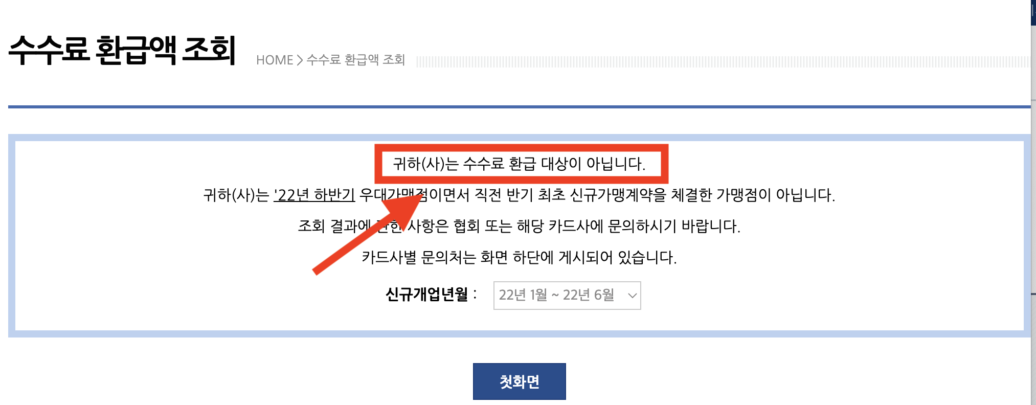 만약 소상공인 카드수수료 환급 금액이 있다면 금액을 확인할 수 있고 없다면 아래와 같이 '귀하(사)는 수수료 환급 대상이 아닙니다'라는 문구가 뜨기 때문에 바로 확인할 수 있습니다.