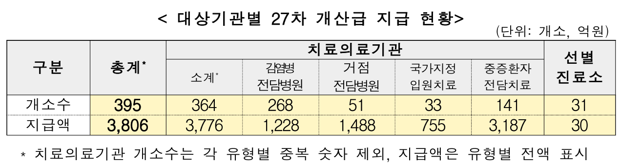 - 손실이 최종 확정되기 전에 잠정적으로 산정한 손실액을 일부 지급하는것- 이번 개산급(27차)은 395개 의료기관에 총 3,806억원을 지급하며, 이 중 3,776억원은 감염병전담병원 등 치료의료기관(364개소)에, 30억원은 선별진료소 운영병원(31개소)에 각각 지급한다.
