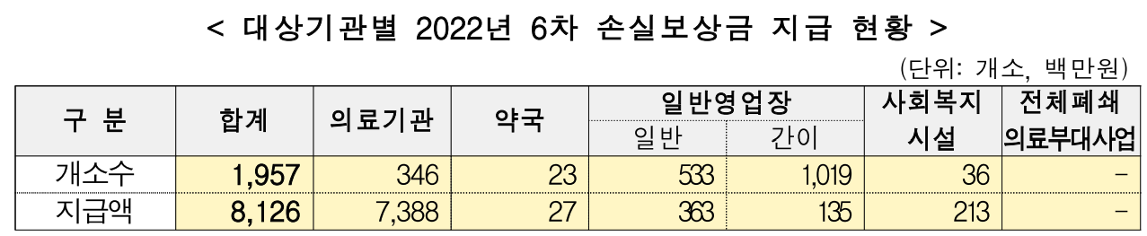 - 폐쇄·업무정지·소독 명령 이행 관련 ’22년 6차 손실보상금은의료기관(346개소), 약국(23개소), 일반영업장(1,552개소), 사회복지시설(36개소) 등 1,957개 기관에 총 81억원이 지급된다.