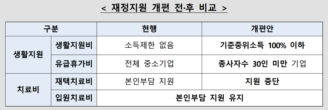 - 치료비 지원 : 상대적으로 고액인 입원치료비는 본인부담금 지원을 지속하고재택치료비에 대한 본인부담금은 개인이 부담하도록 개편