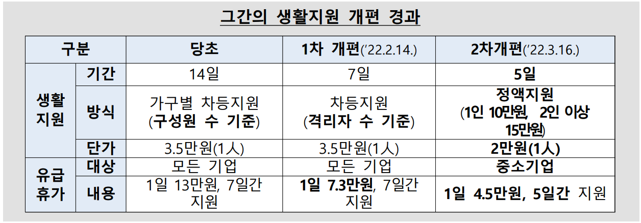 ○ 그간 유행 상황 등을 반영하여 생활지원 및 유급휴가비 대상과지원액 등을 2차례 조정해왔고(’22.2.14. 1차 개편, ’22.3.16. 2차 개편)