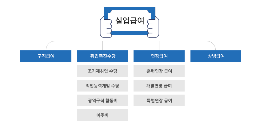고용보험 실업급여 종류- 구직급여, 상병급여, 훈련연장급여, 개별연장급여, 특별연장급여, 취업촉진수당