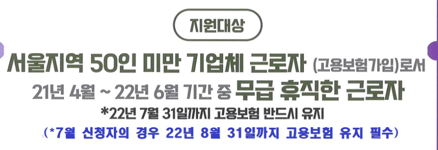 서울 소재 50인 미만 사업체 근로자로서 2022. 7. 31.까지 고용보험을 유지하는 자 (* 7.31.까지 신청자의 경우 8.31.까지 고용보험 유지)