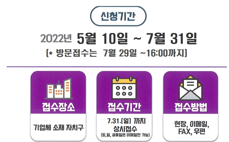 접수장소는 기업체가 소재한 자치구, 접수방법은 현장방문, 이메일, fax, 우편접수 등 총 4가지의 방식으로 접수 신청하면됩니다