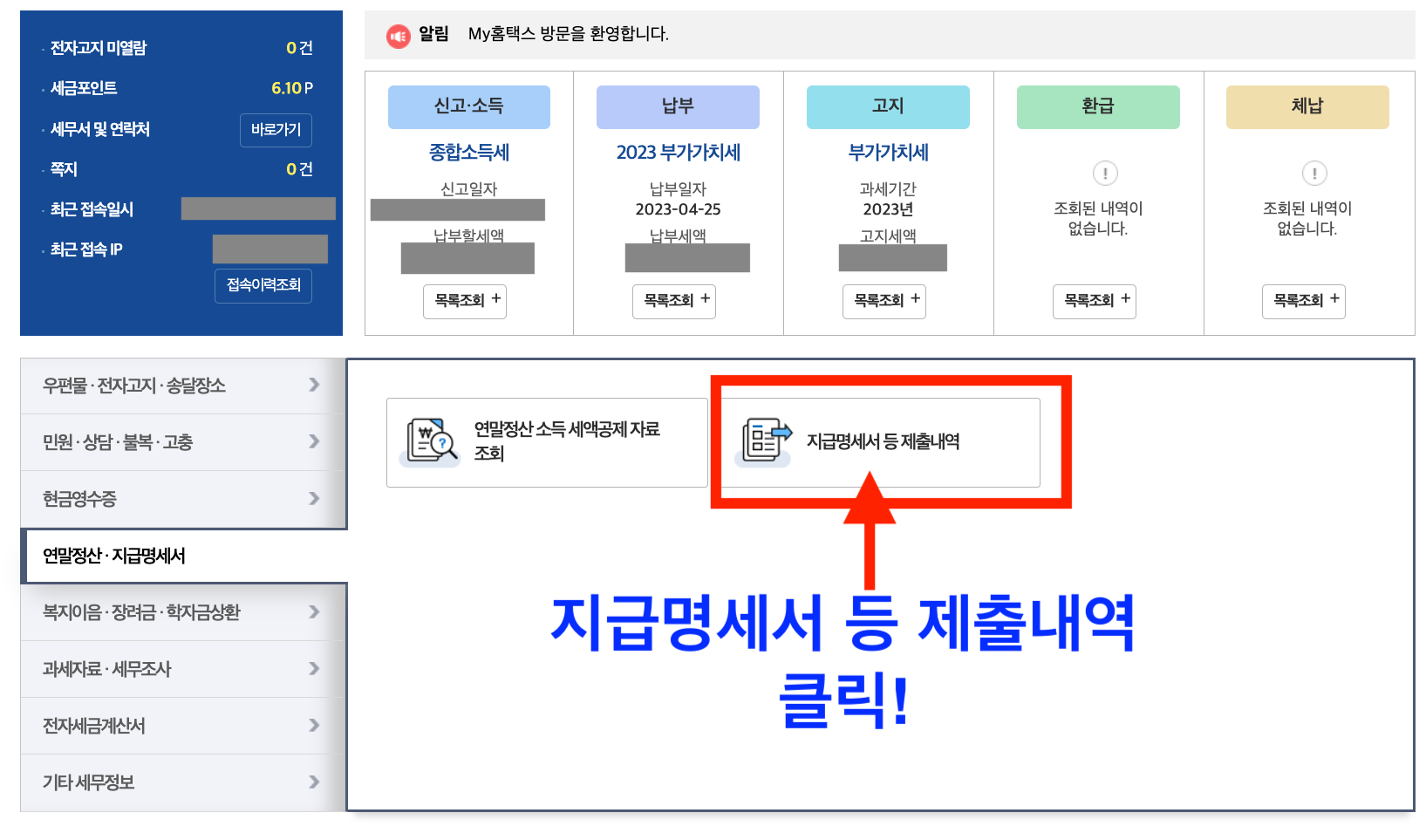 6)지금명세서 등 제출내역 클릭!
