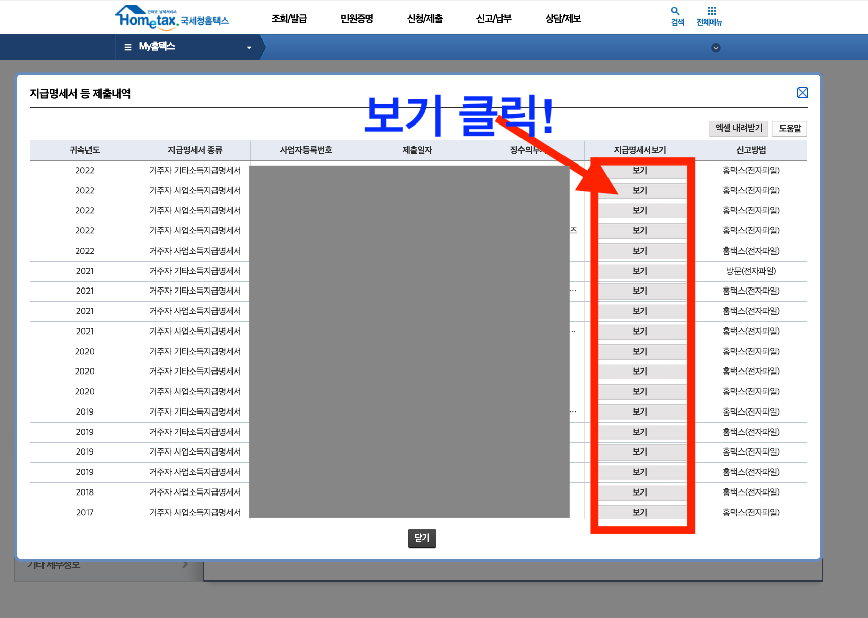 귀속연도와 지급명세서종류 사업자등록번호, 제출일자, 징수의무 옆에 있는 "지급명세서보기"를 클릭합니다.