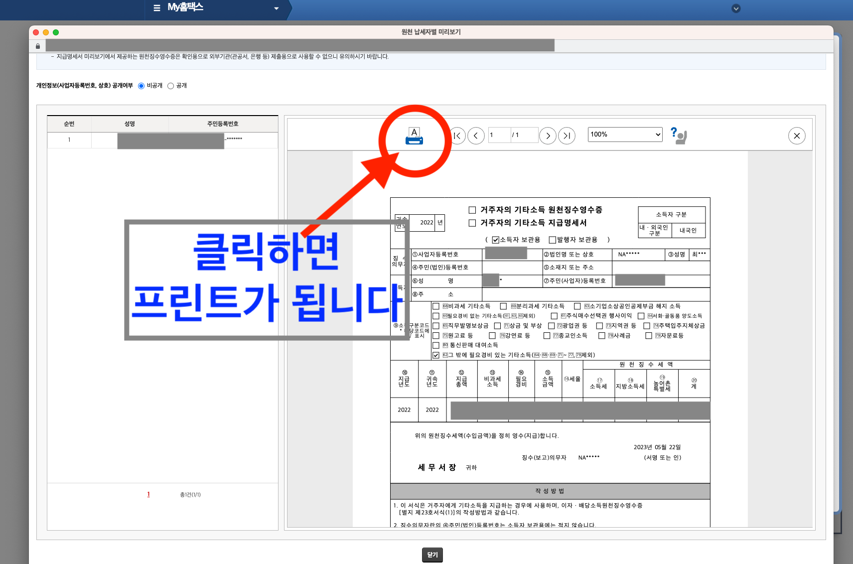 사업소득 원천징수영수증 프린트를 위해서는 아래와 같이 인쇄 이미지 부분을 클릭하면 프린트 화면으로 넘어가면서 인쇄가 됩니다.