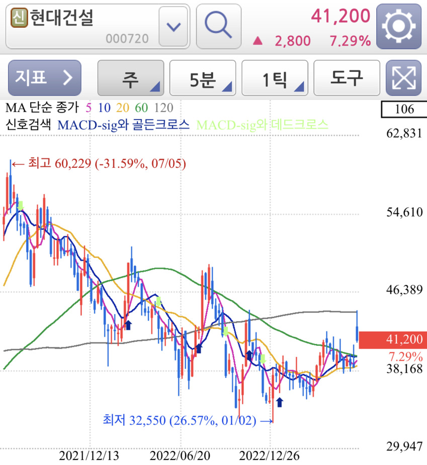 2. 현대건설 차트 주봉/월봉 흐름