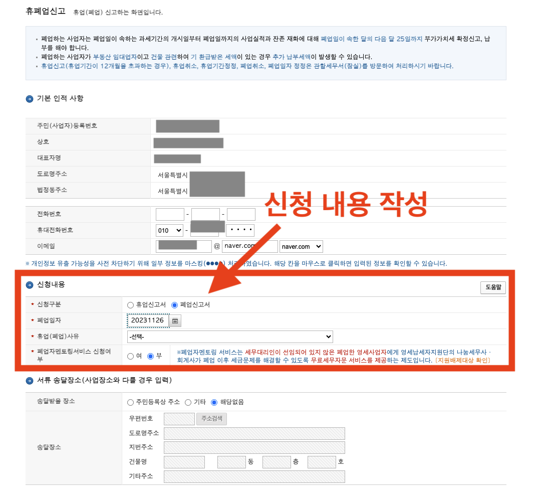 기존 인적사항은 별도로 입력하지 않아도 그대로 따라옵니다. 그리고 아래와 같이 신청내용에서 신청구분(휴업신고서, 폐업신고서)을 선택하고 휴업일자/폐업일자를 적어주고 폐업사윺를 선택합니다.