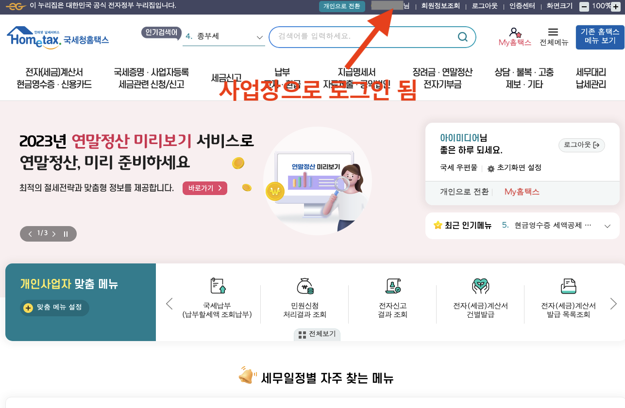 개인으로 로그인한 경우 사업장으로 전환 누르면 아래와 같이 사업장으로 자동으로 국세청 홈택스가 전환됩니다.