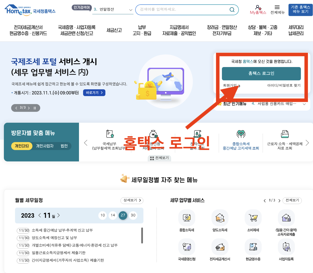 국세청 홈택스 접속 후 우측에 있는 홈택스 로그인을 눌러줍니다.