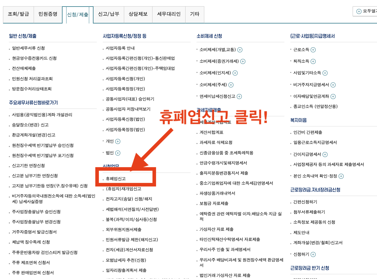 4. 신청/제출 클릭< br /> 5. 휴폐업신고 클릭