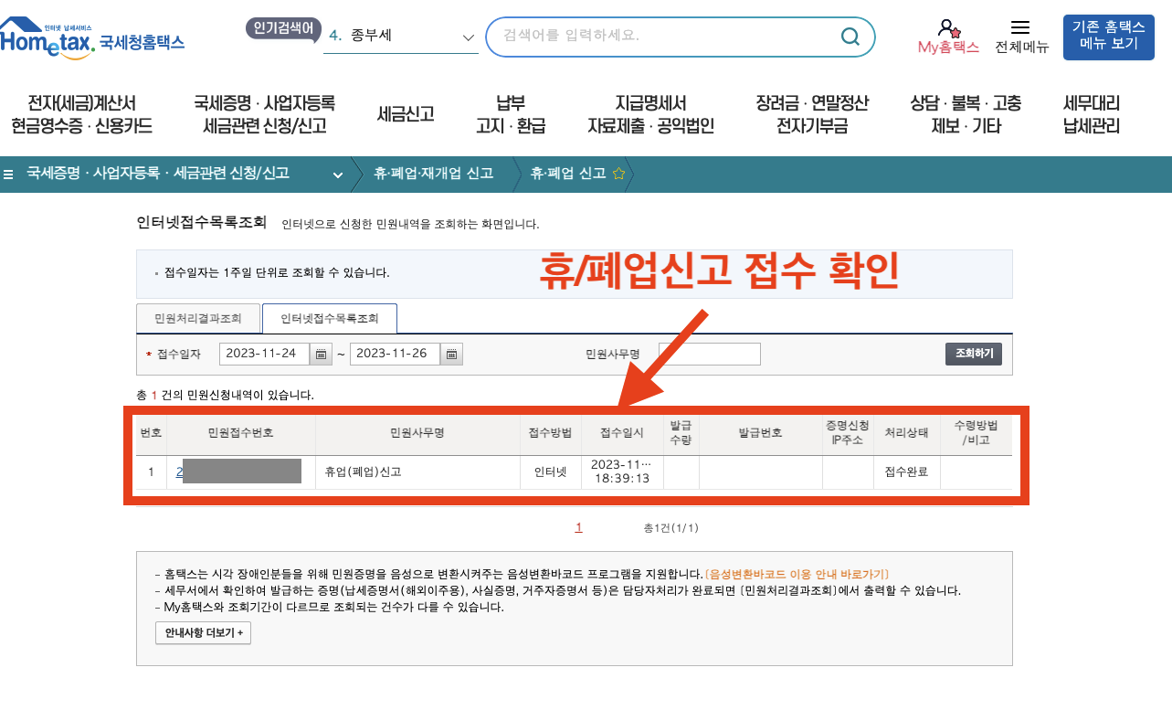 최종 접수가 완료되고 나면 아래와 같이 휴업신고 및 폐업신고의 접수 일시가 표시됩니다. 세무서를 직접 찾아가지 않아도 이렇게 국세청 홈택스를 통해서 개인사업자 소상공인 휴업신고와 폐업신고를 간단하게 할 수 있습니다.