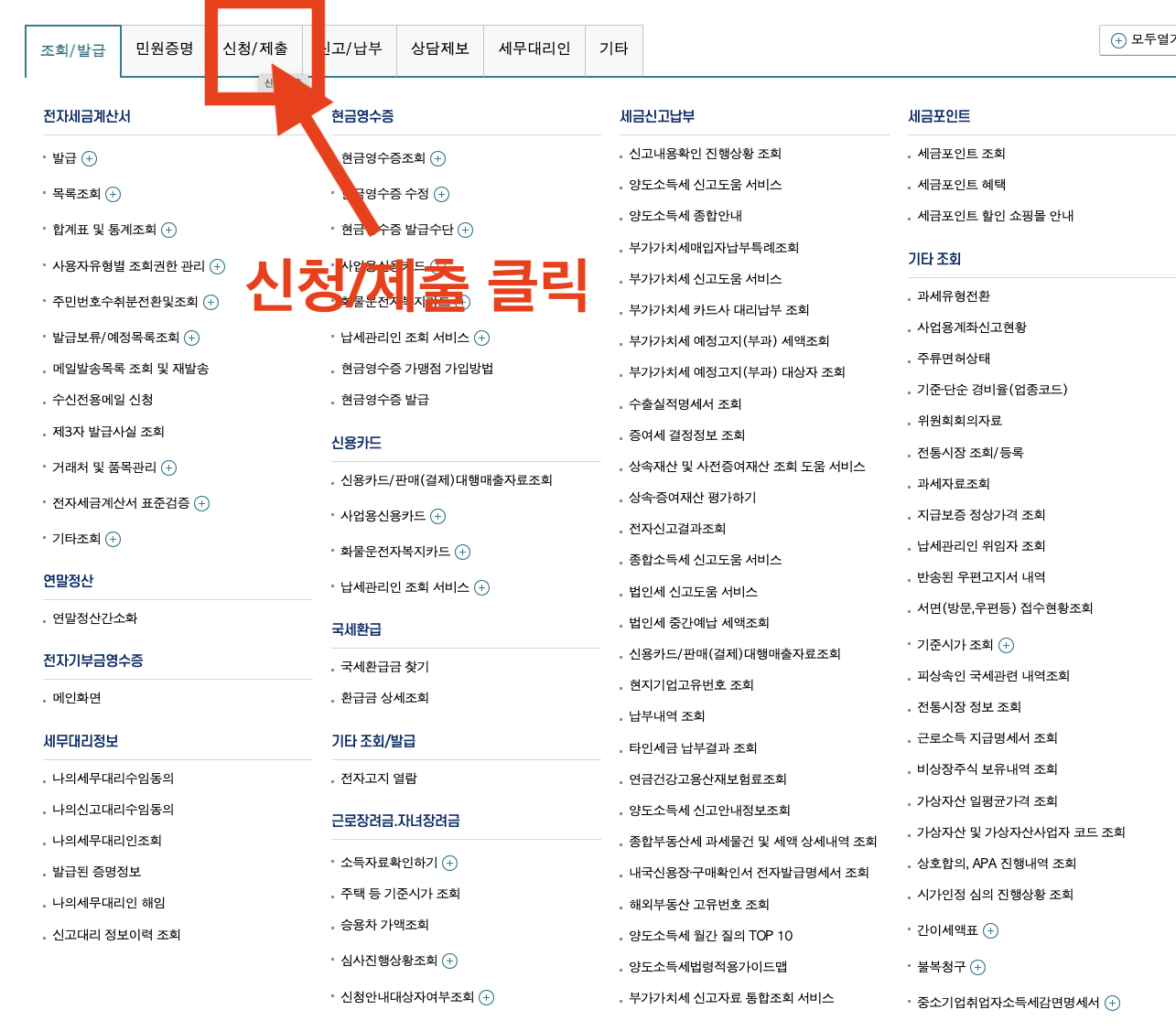 개인사업자 사업장으로 전환한 후에는 홈택스 폐업신고를 하기 위해서 메뉴 상단에 있는 "신청/제출" 메뉴 버튼을 클릭합니다.