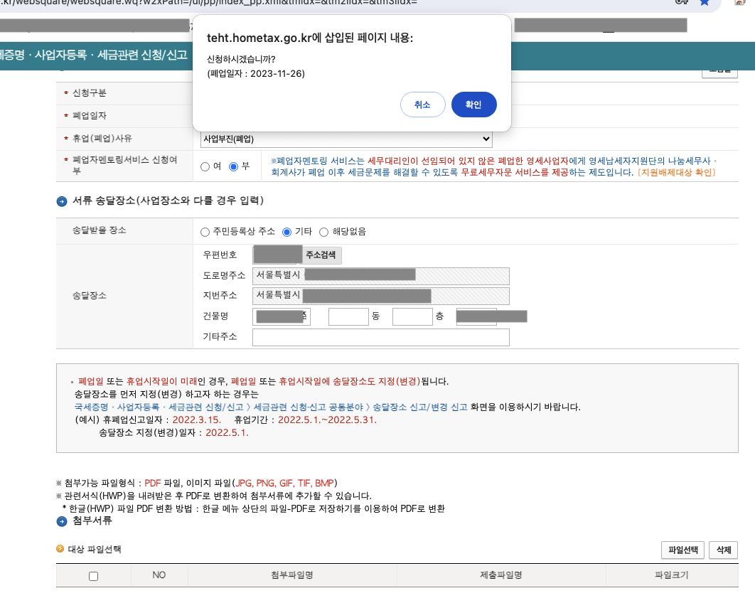 폐업하는 사업자는 폐업일까지의 사업실적에 대한 폐업일에 속한 달의 다음달 25일까지 부가가치세 확정 신고·납부를 해야하면, 실적이 없는 경우에도 무실적 신고를 반드시 해야 한다는 내용의 팝업이 뜨면 확인을 눌러줍니다.