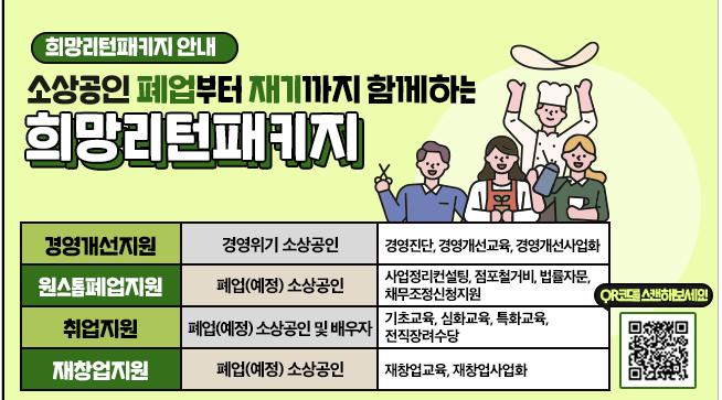 경영개선지원, 원스톱폐업지원, 취업지원, 재창업지원 프로그램이 있으니 필요한 내용은 지원받으면 좋을 것 같습니다.