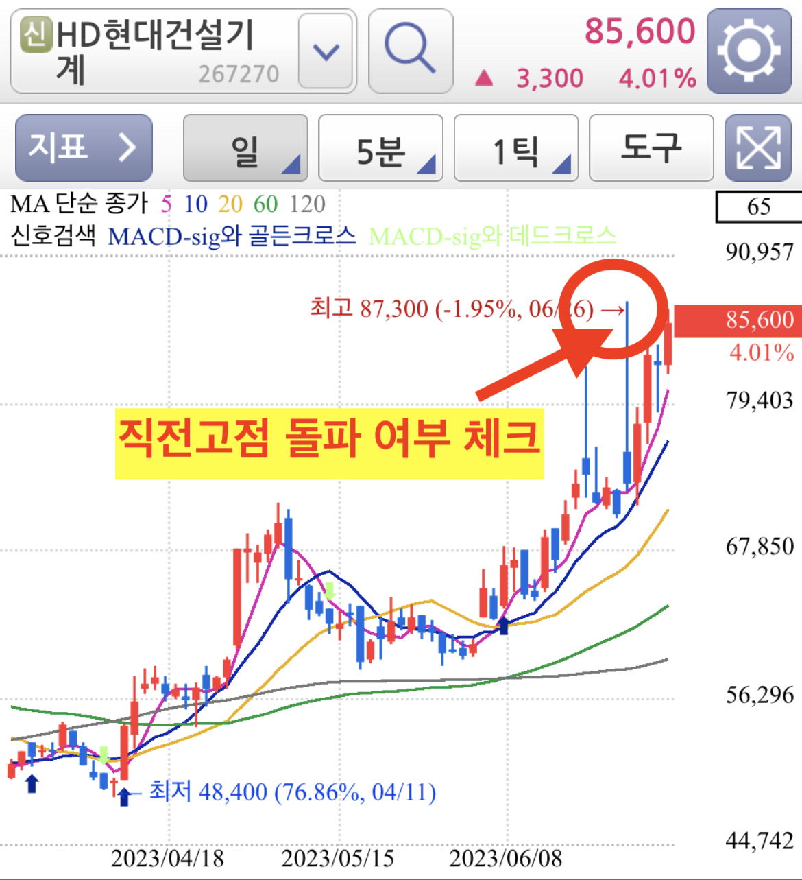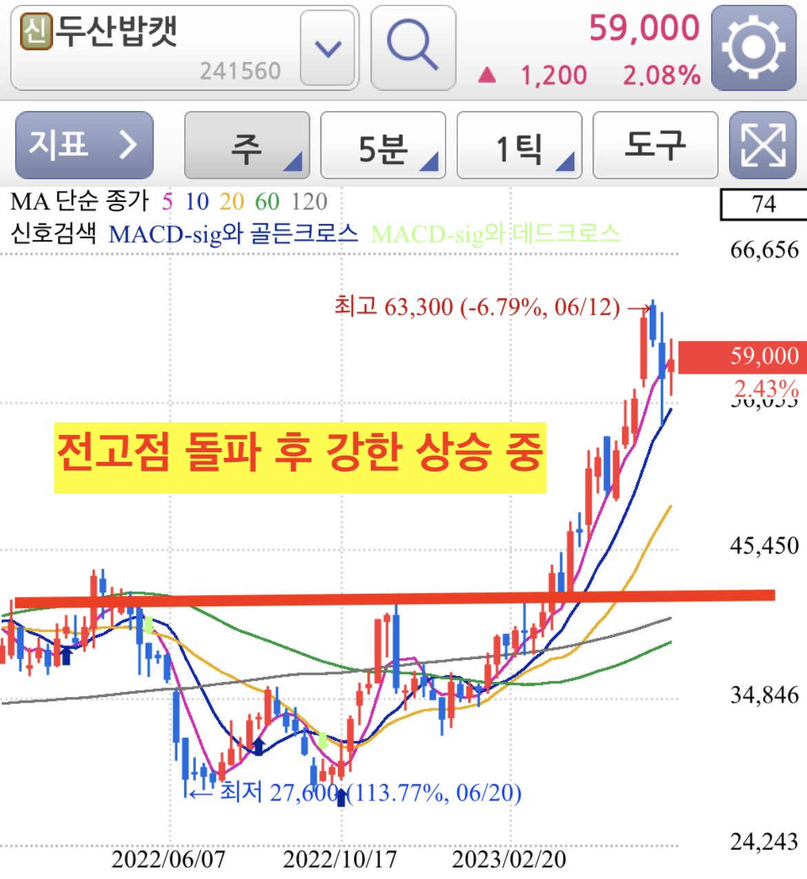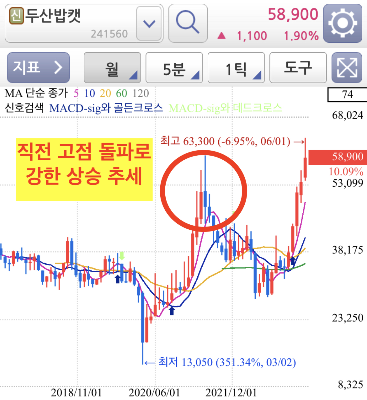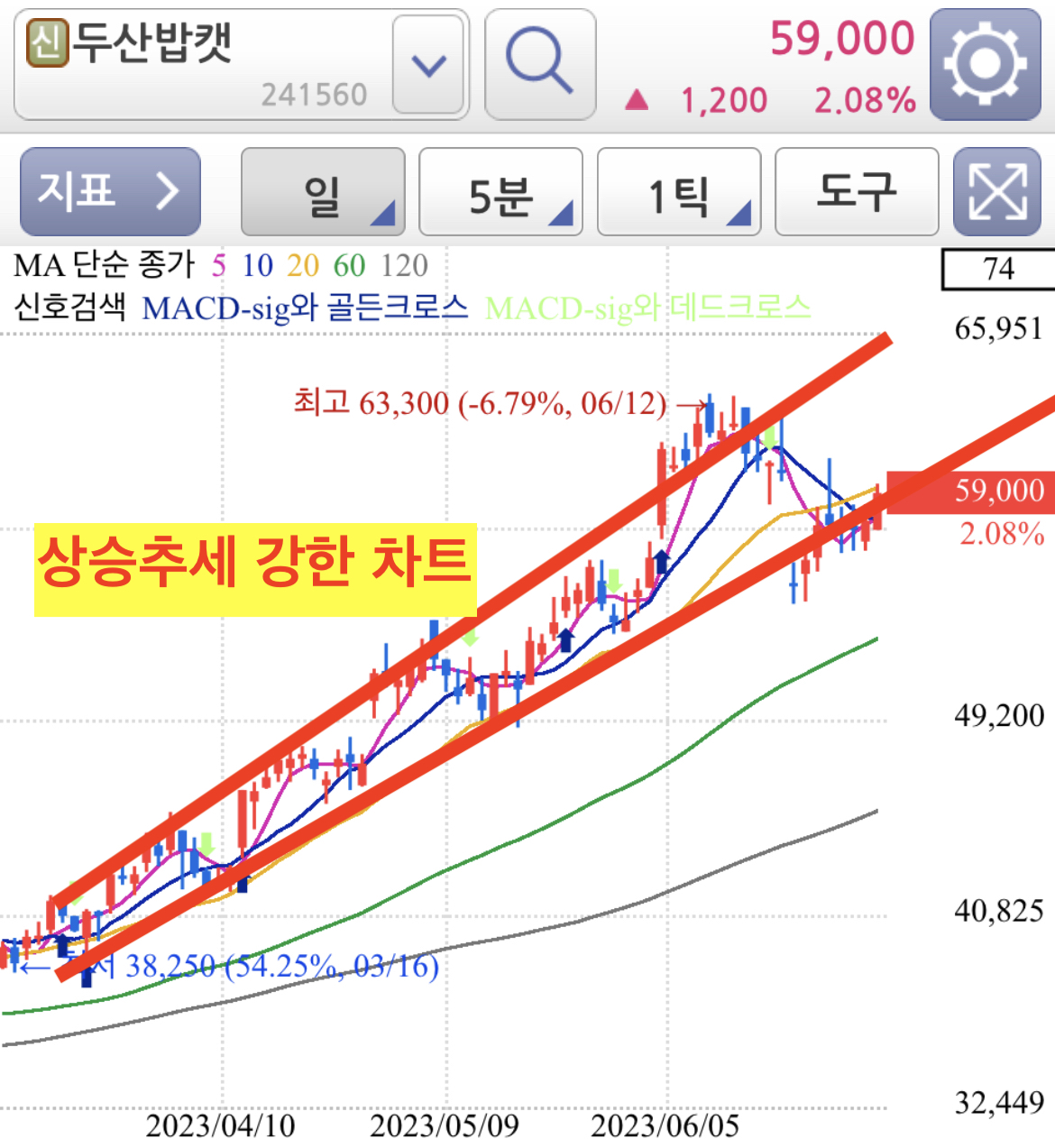 두산밥캣 차트 분석을 해보면, 일봉상 저점과 고점을 모두 높이면서 매물소화 과정도 거치면서 꾸준하게 정말 강한 상승세가 보여지는 종목입니다.