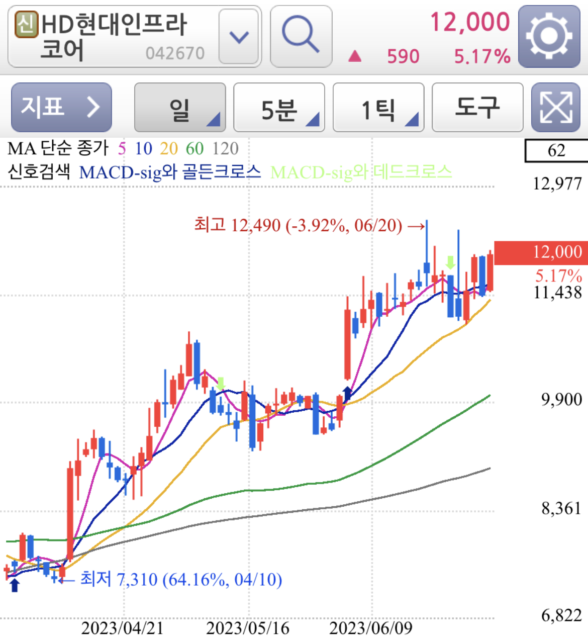 HD현대건설기계 일봉 차트는 단기적으로 추세 차트는 좋아보입니다.