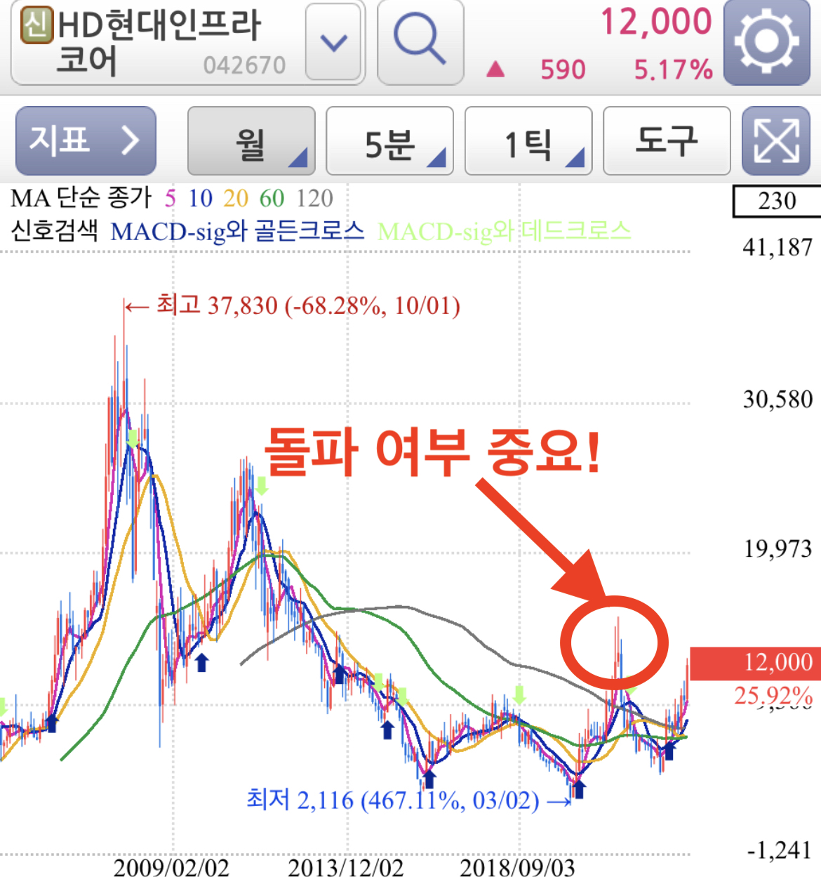 월봉 차트로 보면 직전 고점을 돌파하느냐 다시 고점 돌파를 못하고 하락하느냐가 월봉의 과점에서는 중요하다고 보여집니다.