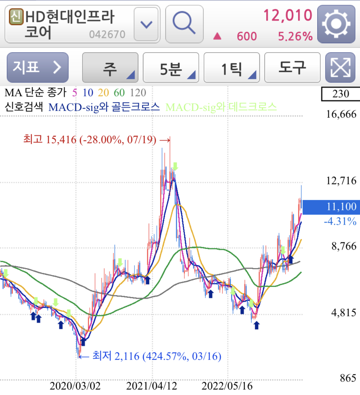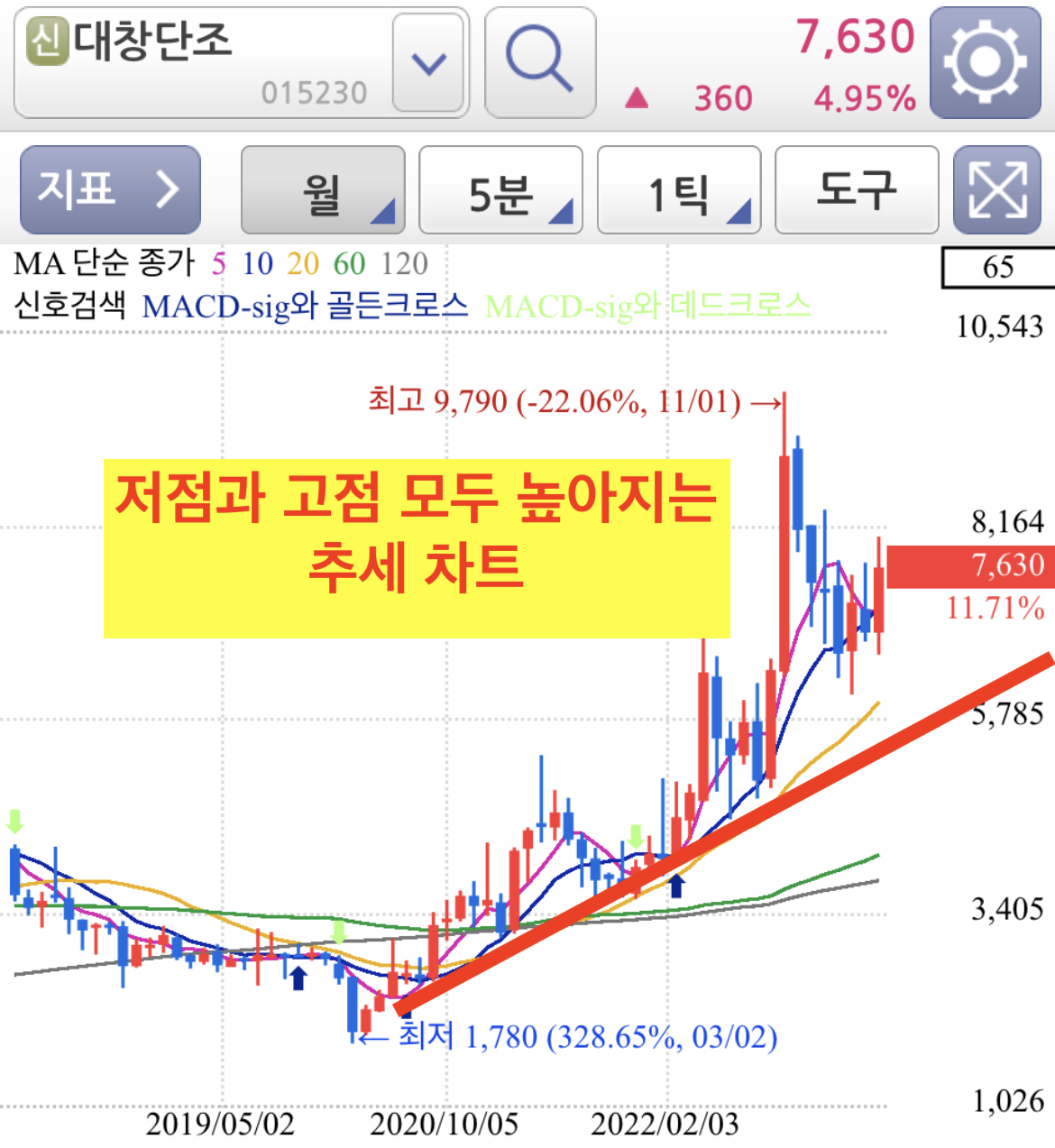 주봉차트로 전고점을 돌파하고 강하게 상승추세이고