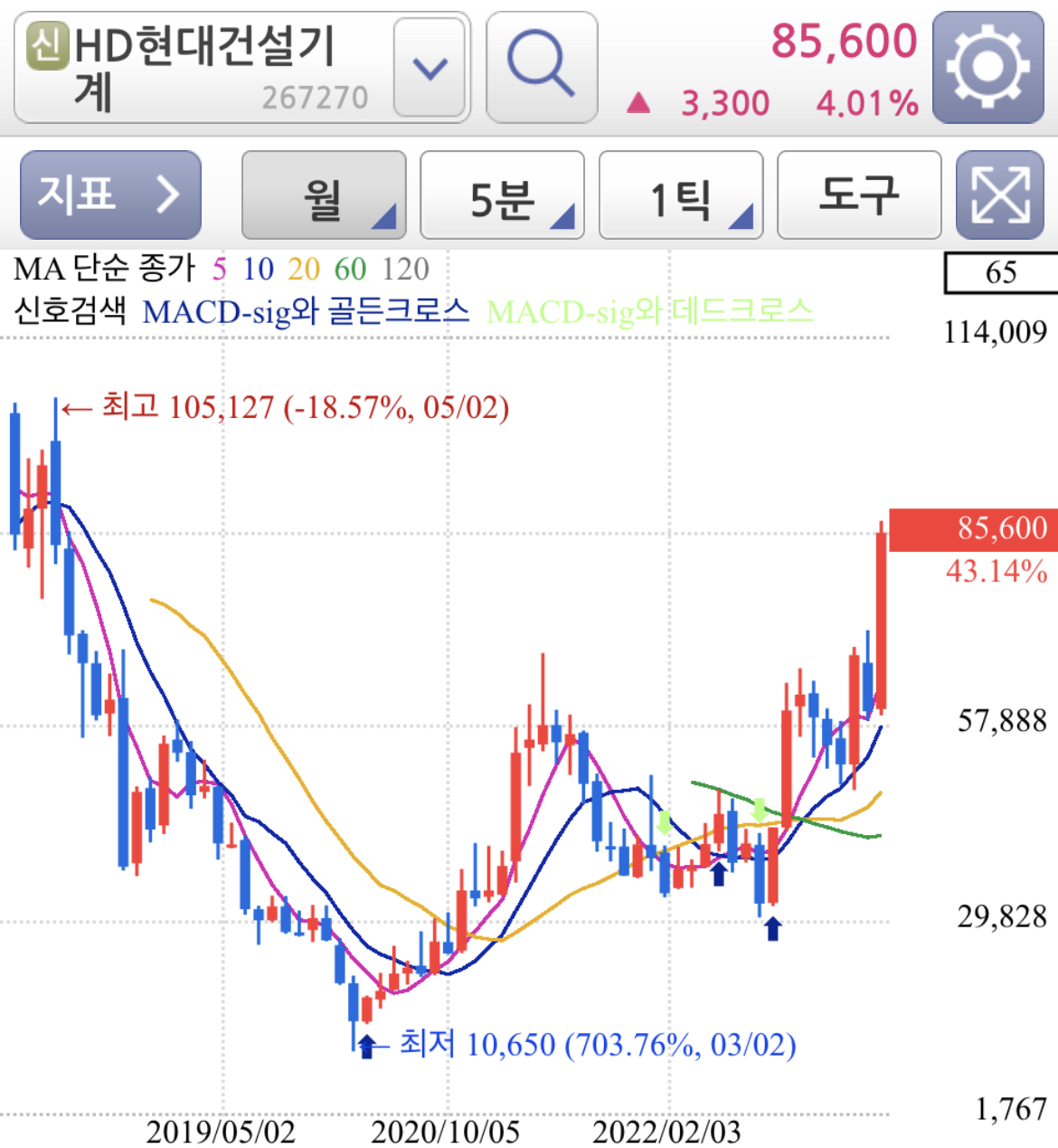HD현대건설기계 주봉과 월봉 차트로 보면