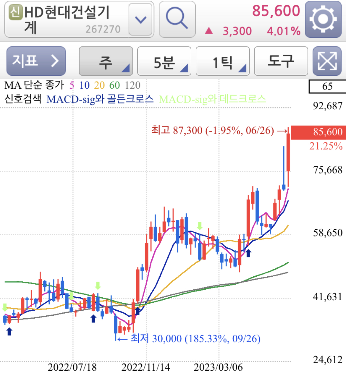 주봉차트는 강하게 양봉으로 말아 올리고 있어 상승 추세가 강한걸 알 수 있습니다.