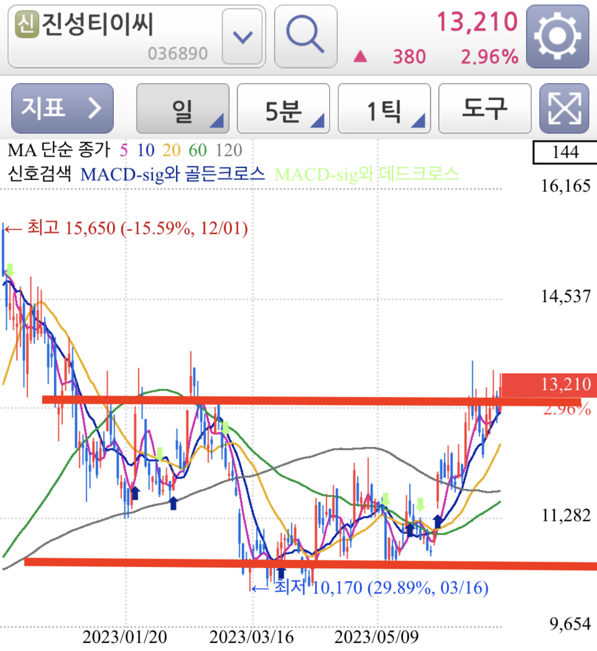 주가는 일봉상 차트로 보면 박스권에서 머물러 있고 최근 1차 박스권을 돌파하고 2차 박스권 돌파를 시도하고 있는 것으로 보여집니다.
