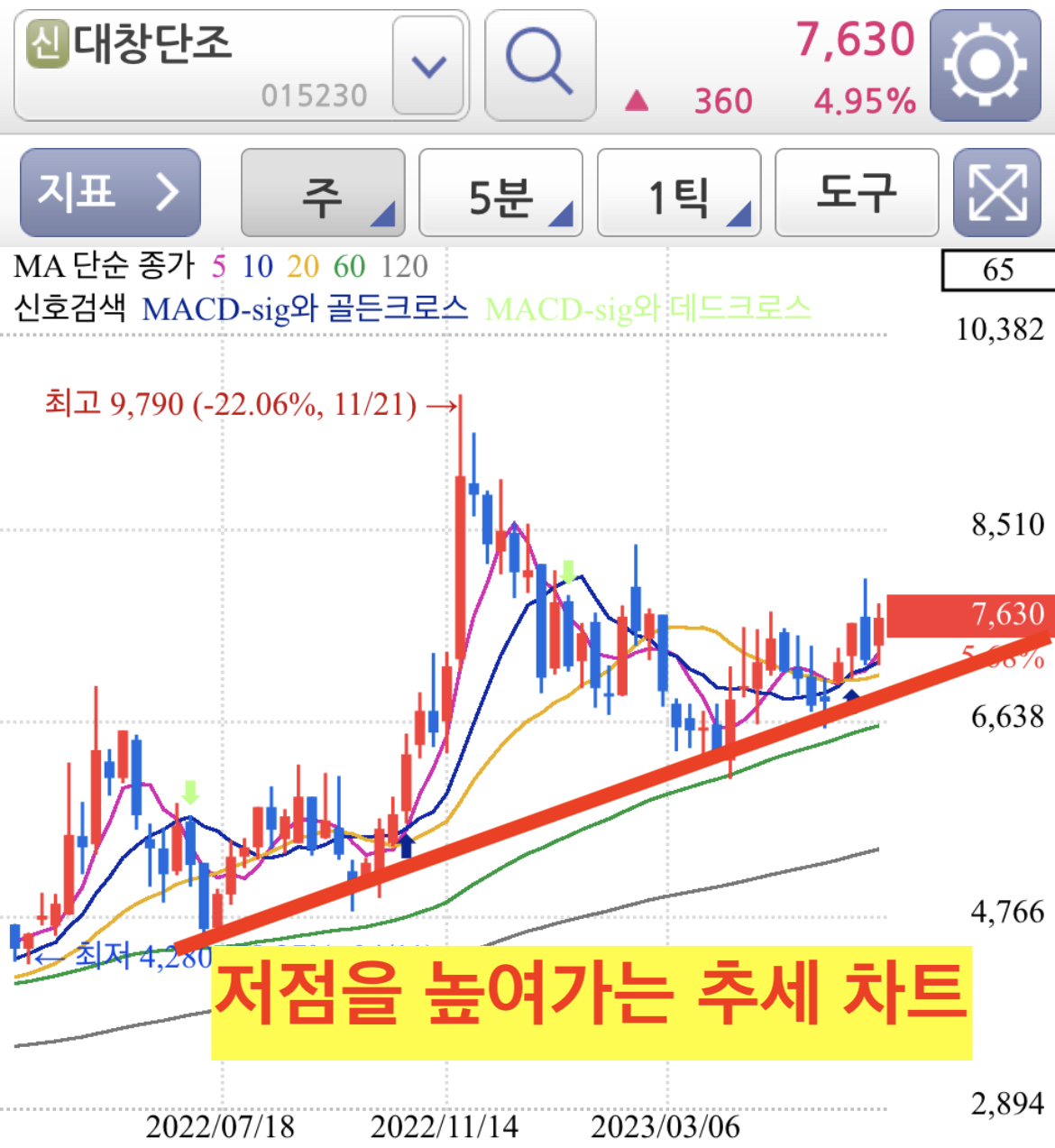 일봉 대창단조 주가차트는 일봉차트로만 보면 음봉과 양봉이 섞이면서 혼조세로 보입니다.