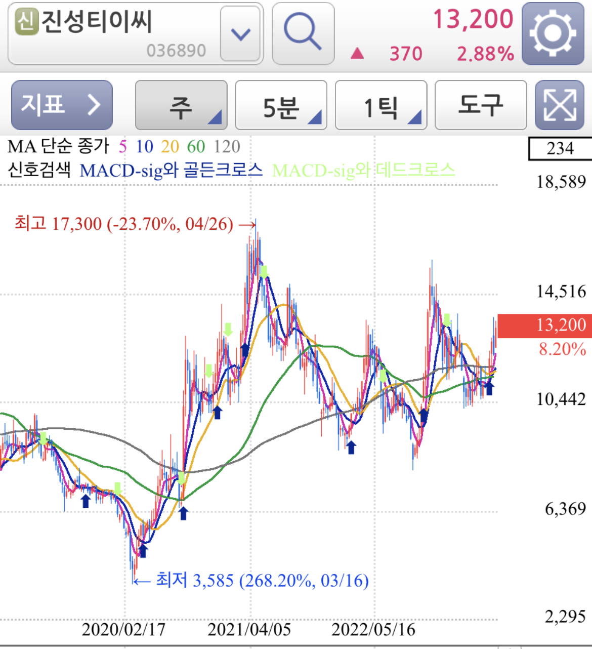 주봉으로 보면 하락후 상승 전환하여 추세가 살아있고