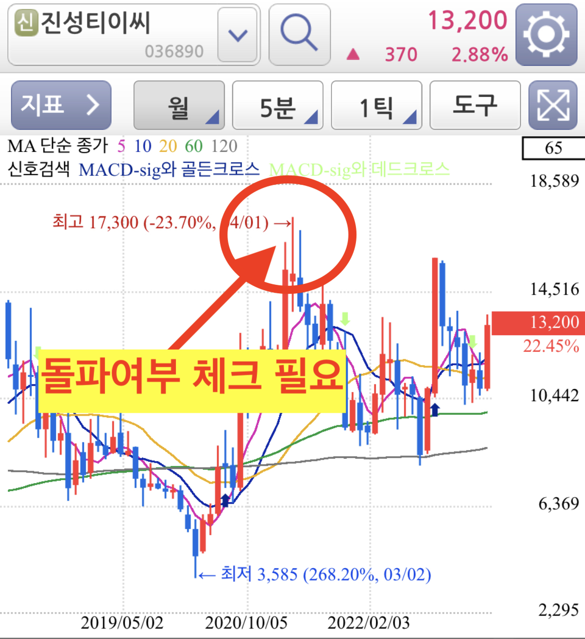 진성티이씨 주봉 차트 또한 직전고점 직직전 고점 등 전고점 돌파를 위하 매물량이 많아 강하게 돌파하는 이슈가 나와야만 조정없이 상승 추세가 이어질 것으로 보여지며 추세만 놓고 보면 전고점 돌파 여부를 지켜봐야게씁니다.