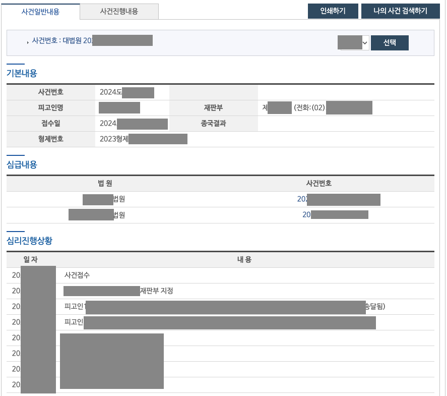 모두 입력후 조회 버튼을 클릭하면 아래와 같이 대법원 "나의 사건검색" 내용이 뜹니다.