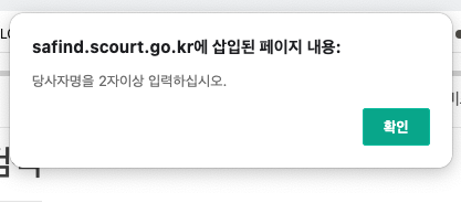 사건번호 뒤에 있는 "담당자명 필수입력"칸은 진행 중인 사건의 해당자 이름을 입력해줍니다. 만약 입력을 하지 않으면 아래와 같이 입력하라는 팝업이 뜨기 때문에 반드시 입력해야 합니다.