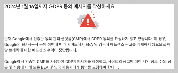 공지 내용을 요약하면 2024년 1월 16일부터는 EEA 및 영국에서는 애드센스 광고를 게재하기 위해서는 구글이 인증한 동의 관리 플랫폼인 CMP에서 GDPR 동의를 해야만 광고가 뜨고 수익이 잡히게 된다는 내용입니다.