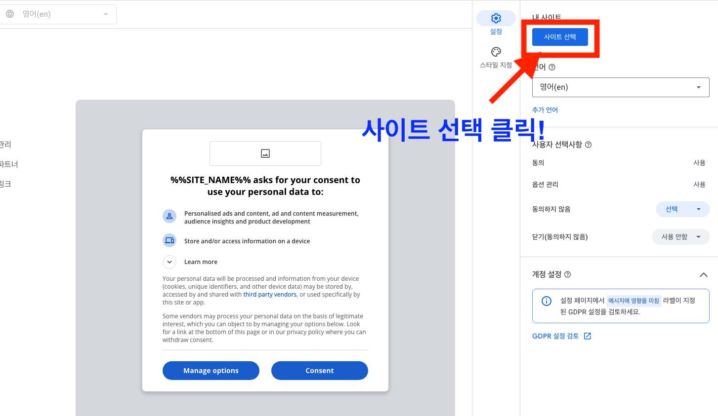 먼저, 내가 원하는 사이트에 GDPR 메세지를 작성하기 위해서 우측 상단의 "사이트 선택"을 클릭합니다.
