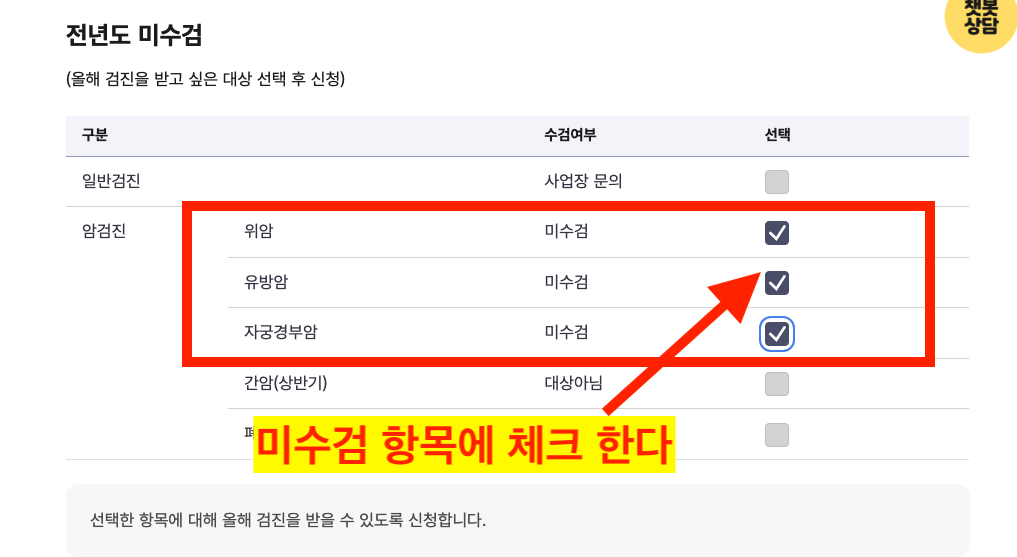 전년도 미수검 검진 내용 중 올해 검진을 받고 싶은 대상 항목을 선택하고 우측 체크표시에 체크를 해준다.