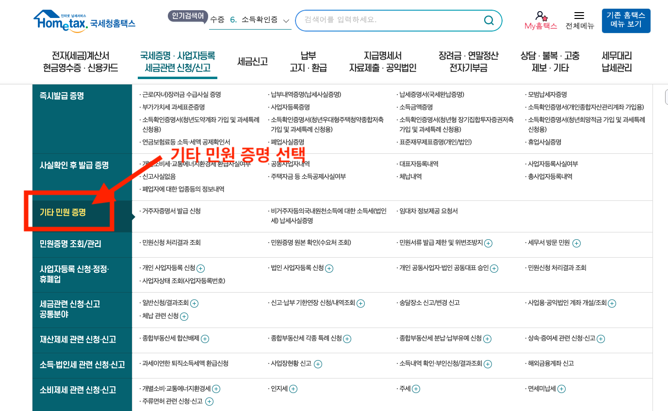 국세청홈택스 로그인 → 국세증명 사업자등록 세금관련 신청/신고 → 기타 민원증명 순서대로 메뉴를 선택해 주면 됩니다.