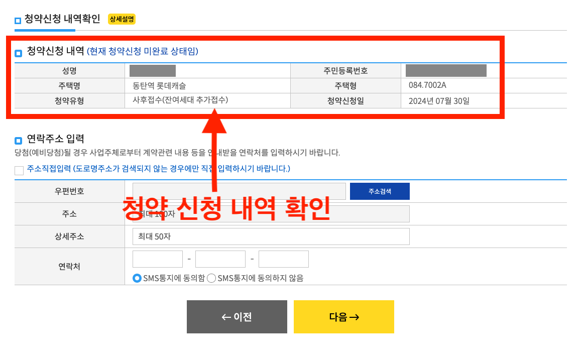 청약자의 우편번호, 주소, 상세주소, 연락처를 입력해주고 당첨시 SMS 통지에 동의함에 체크해주면 당첨시 문자로 연락이 옵니다.