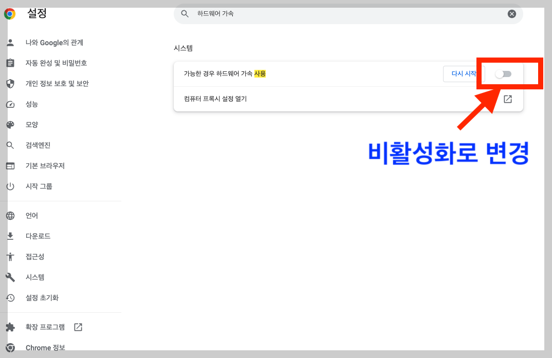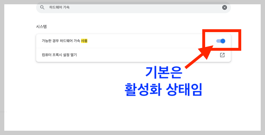 시스템 부분에 "가능한 경우 하드웨어 가속 사용" 화면이 기본 설정화면이 활성화 되어 있습니다.