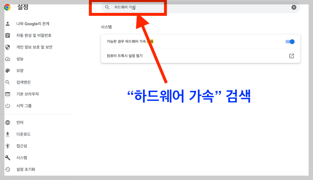 설정 화면에서 아래와 같이 검색 창에 '하드웨어 가속'을 검색해줍니다.