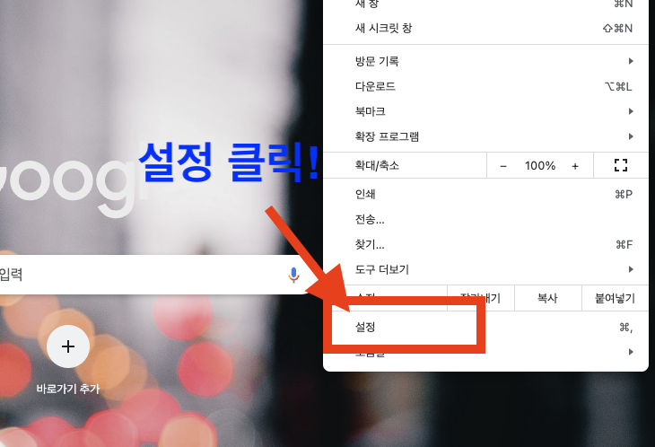먼저 크롬을 실행 시킨 후에 아래와 같이 '설정' 모드로 접속합니다.