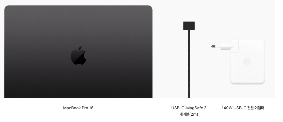 MacBook 16인치 M3칩 적용모델 구성품은 제품 본체, USB C타입 맥세이프3 케이블(2m), 140W USB-C 전원 어댑터로 구성되어 있습니다.