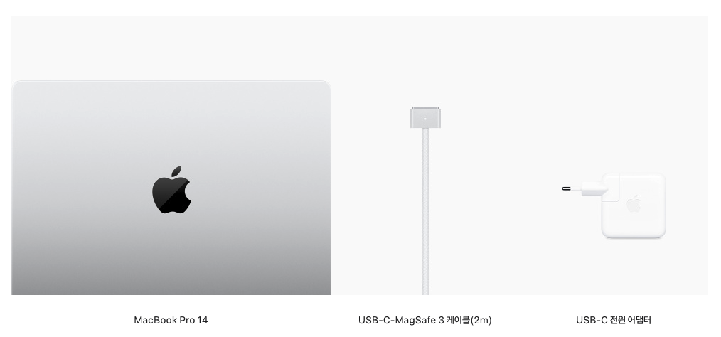 MacBook Pro 제품의 구성품은 이전과 동일하게 제품 본체, C타입 맥세이프 3 케이블(2m), USB Type-C 전원 어댑터로 구성되어 있습니다