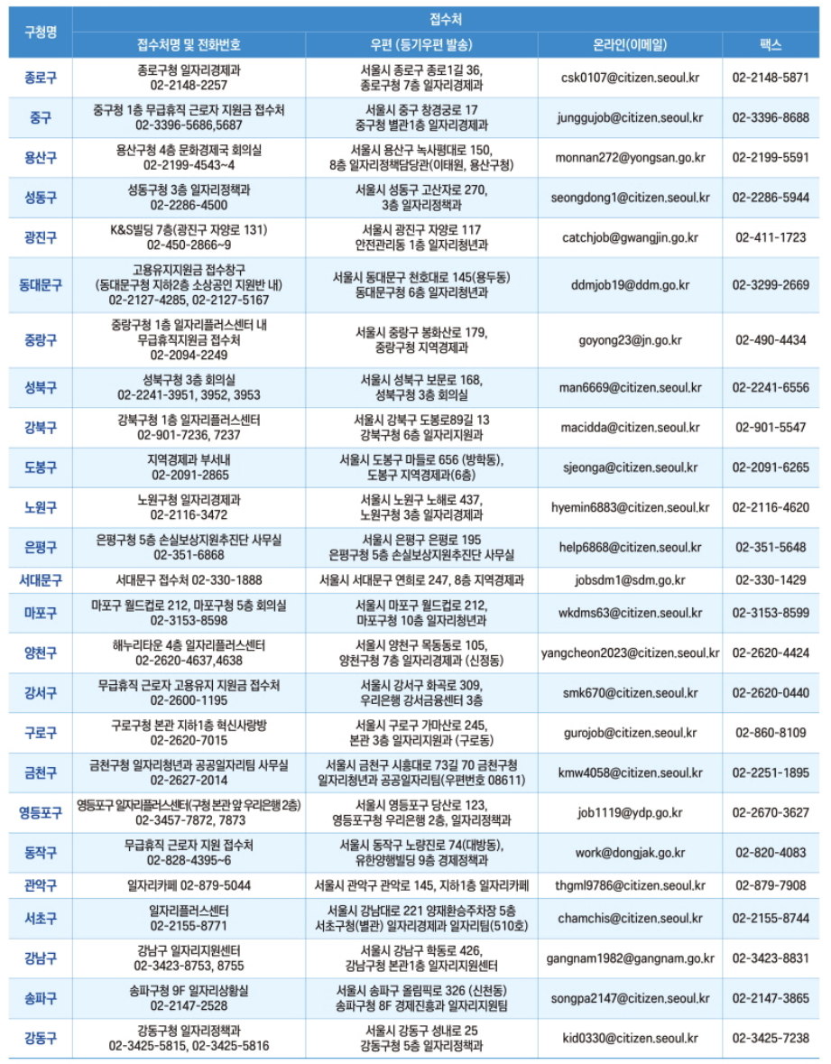 서울시 종로구, 중구, 용산구 등 지역 구별 자치구별 담당자 및 접수처 주소, 이메일, 팩스번호입니다.