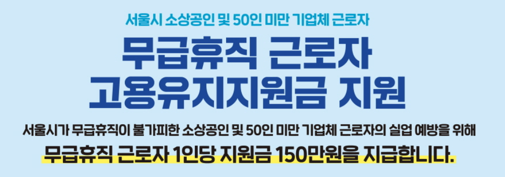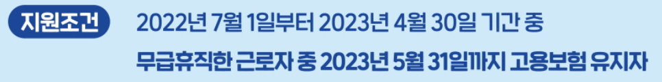 - 22. 7. 1 ~ 23. 4. 30 기간 중 월 7일 이상 무급휴직을 실시한 서울 소재 소상공인 및 50인 미만 사업체 근로자로 23년 5월 31일까지 고용보험을 유지하고 있는 자