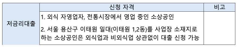 - 서울 용산구 이태원 일대(이태원 1,2동)를 사업장 소재지로 하는 소상공인은 외식업과 비외식업 상관없이 대출 신청 가능